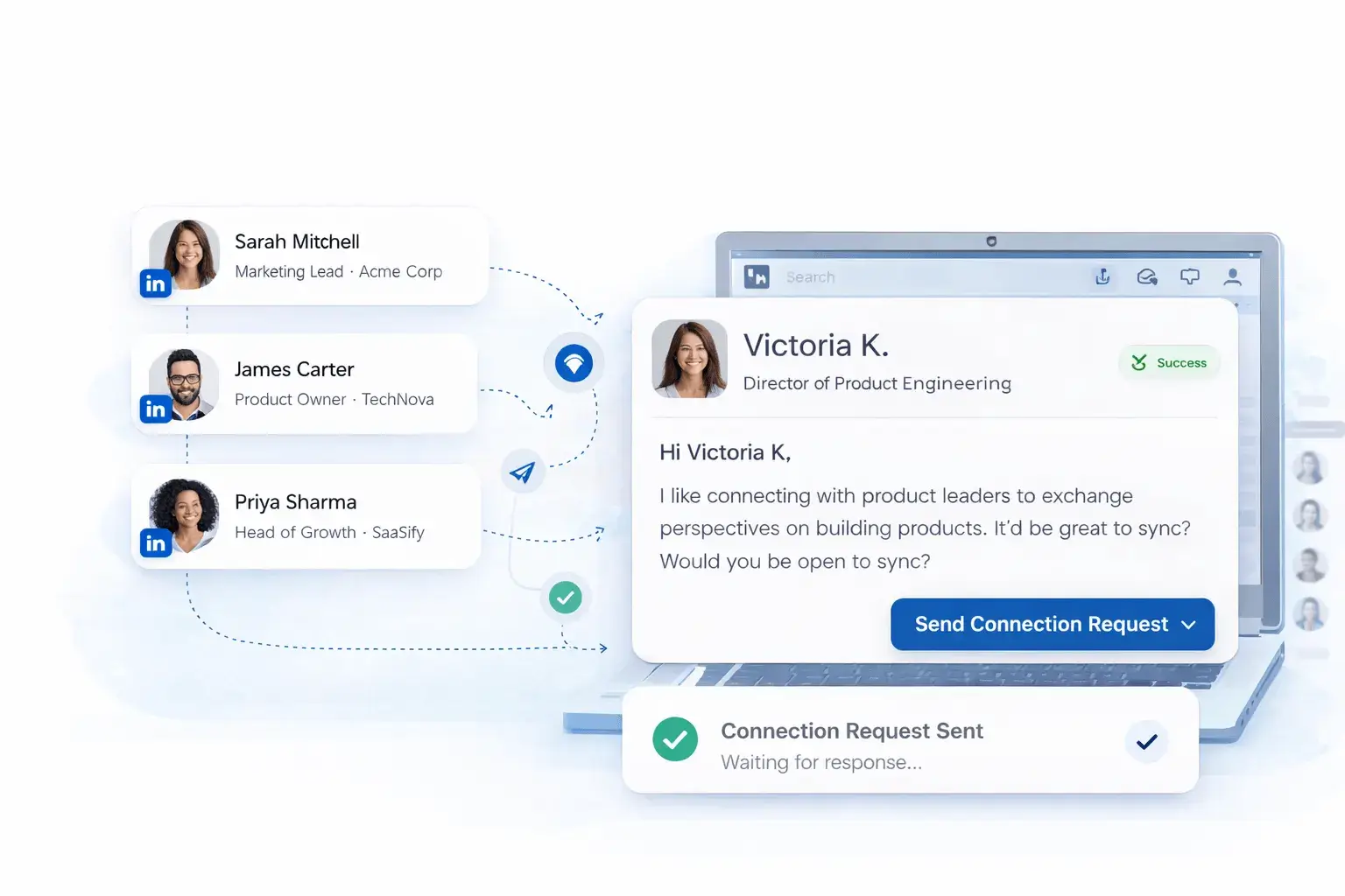Use AI to create context-aware connection messages personalized to each profile – no manual writing required